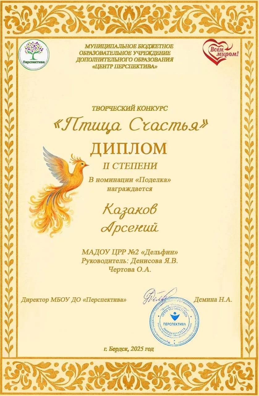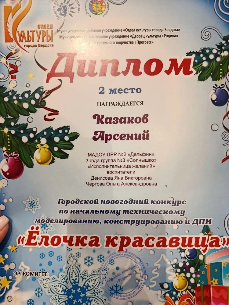 Диплом 2 место Казаков Арсений