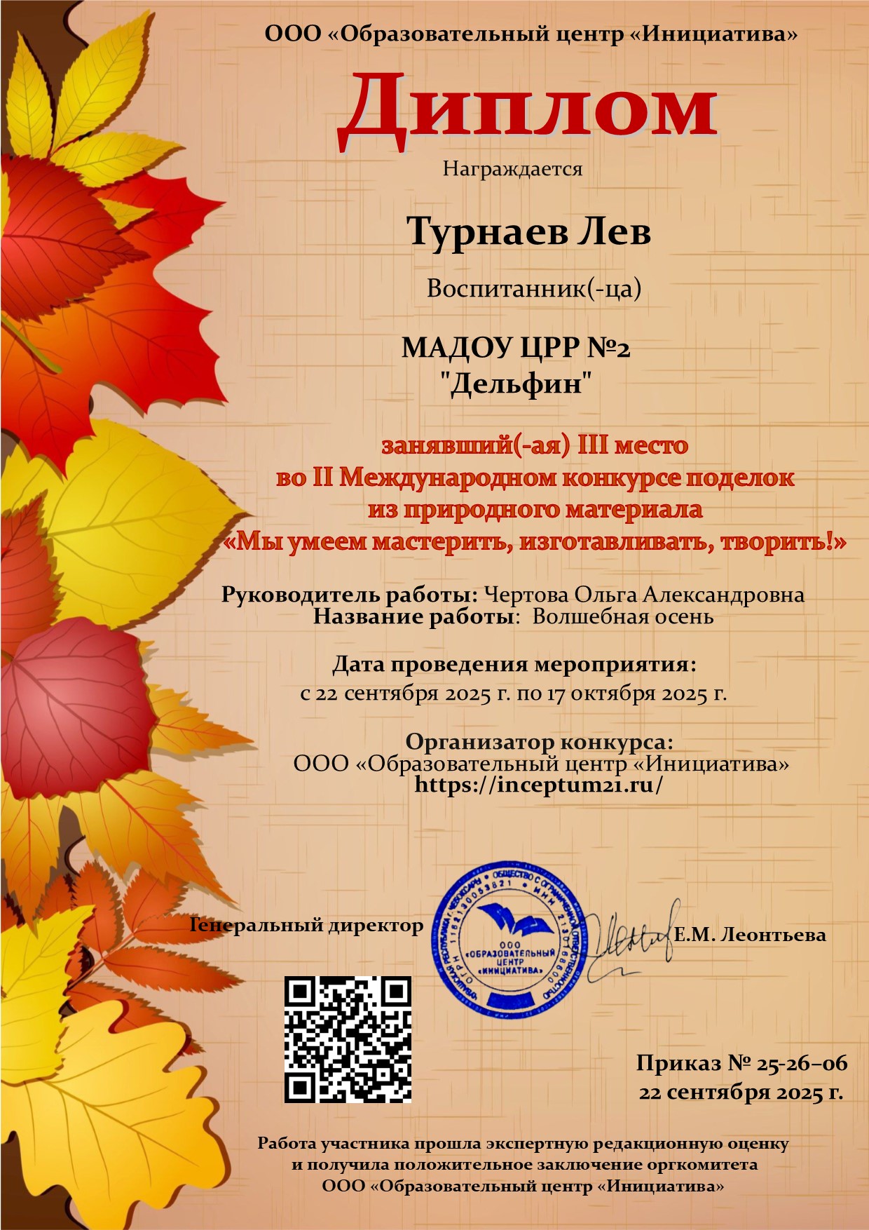 Диплом 3 место Турнаев Лев
